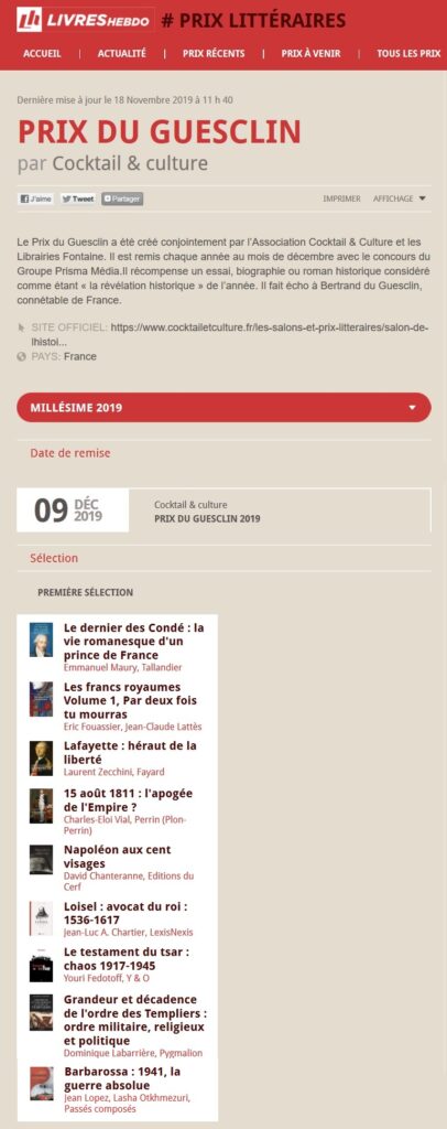 Médias 2019 10e Salon de l’Histoire – Prix du Guesclin, Prix de la Mairie du 8e, Trophée de la Biographie Gonzague Saint-Bris, Prix des Empires 2019 ParCocktail_et_Culture 12 novembre 2019