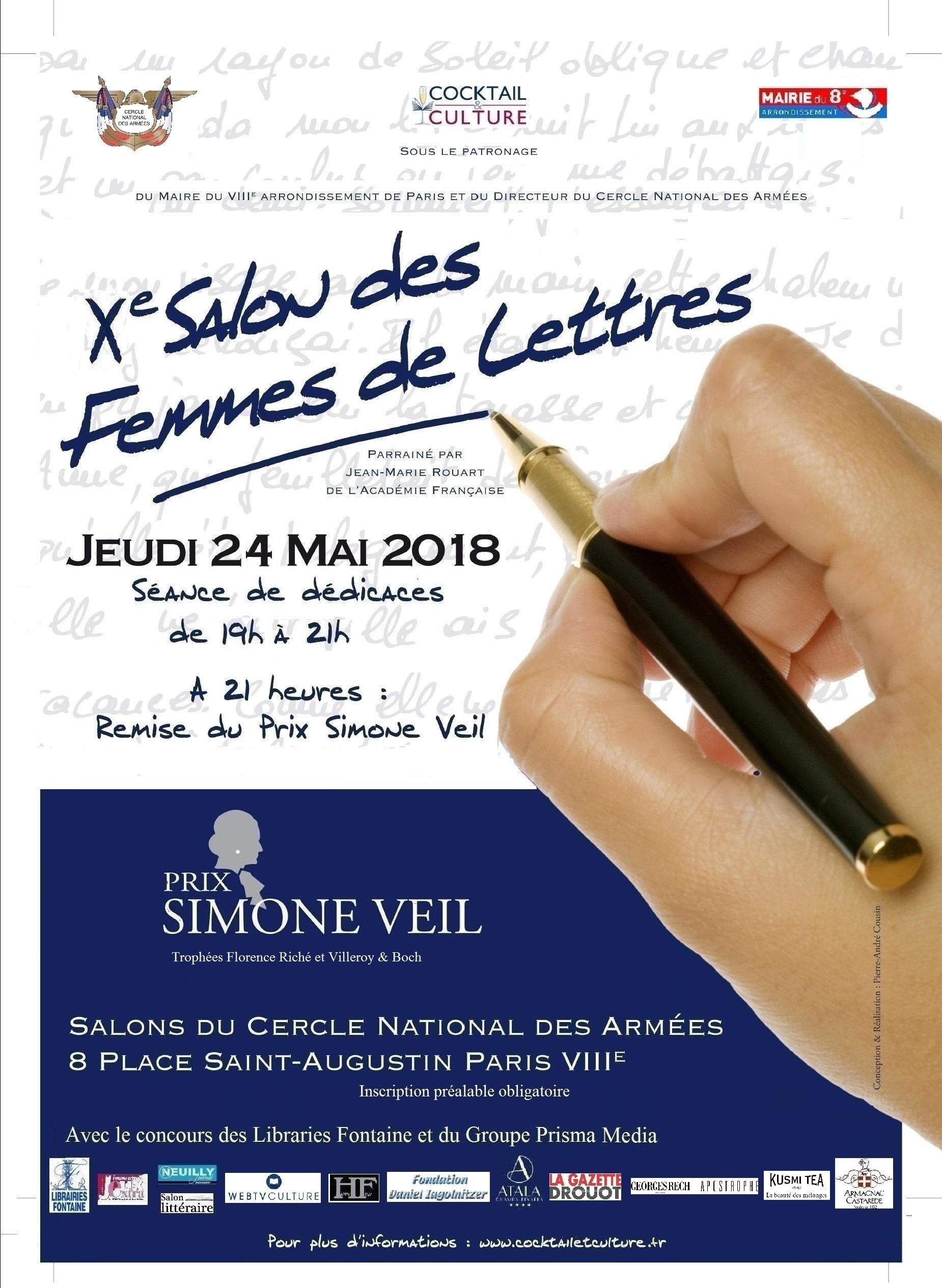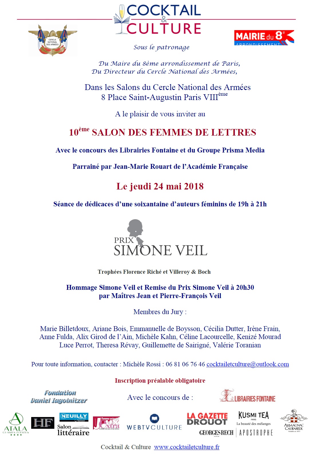 Le 10ème Salon des Femmes de Lettres aura lieu le jeudi 24 mai 2018 de 19h à 21h au Cercle National des Armées 8 place Saint-Augustin Paris 8ème.
