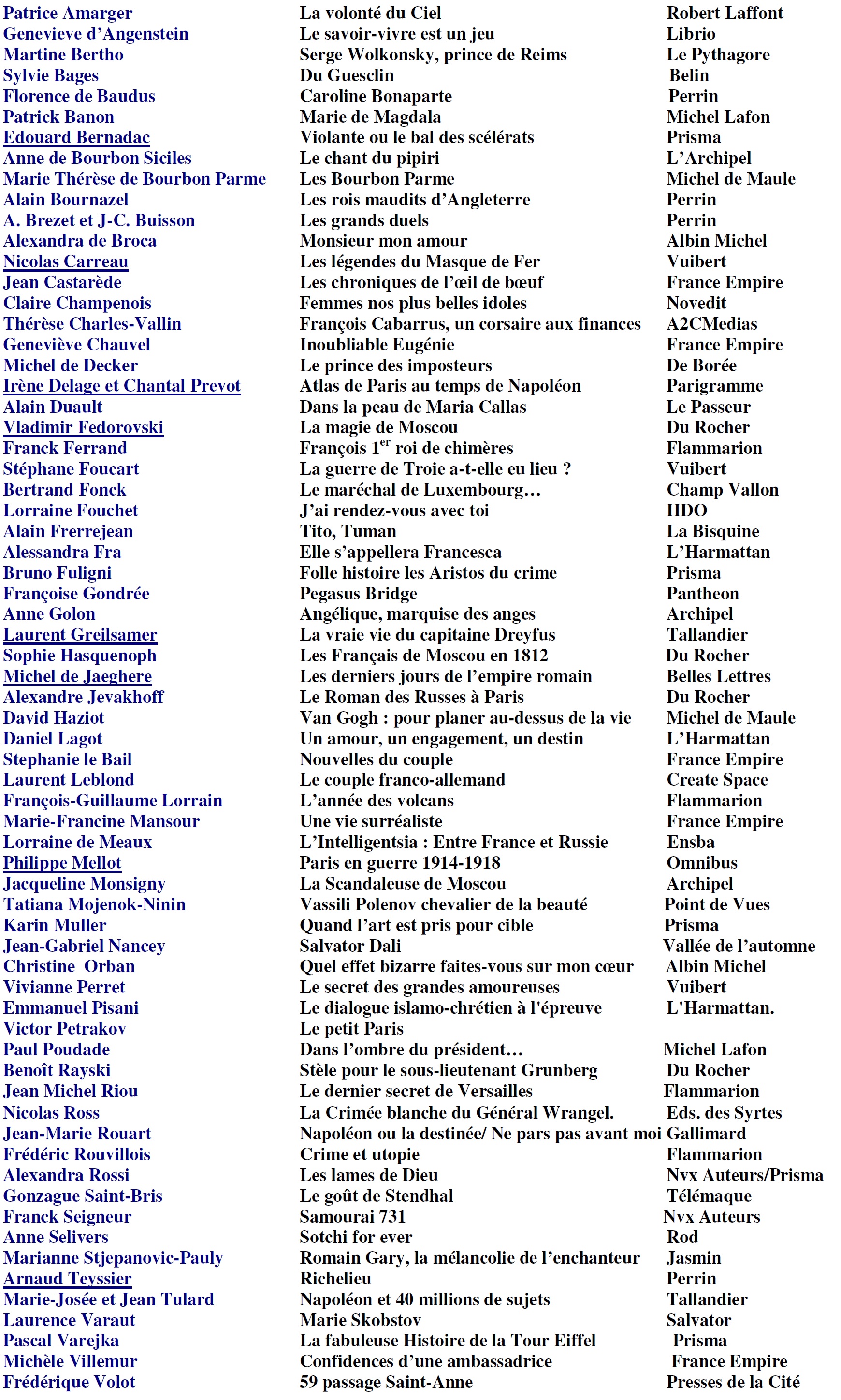 Membres du Jury : Jeanc-Christophe Buisson, Jean Castarède, Michel de Decker, Franck Ferrand, Bruno Fuligni, Jean-Pierre Guéno, Laurent Guillemot, Gonzague Saint-Bris, Jean Tulard, Membre de l’Institut, Clémentine Portier-Kaltenbach, Jean-Peirre Vrignaud, Emmanuel de Waresquiel