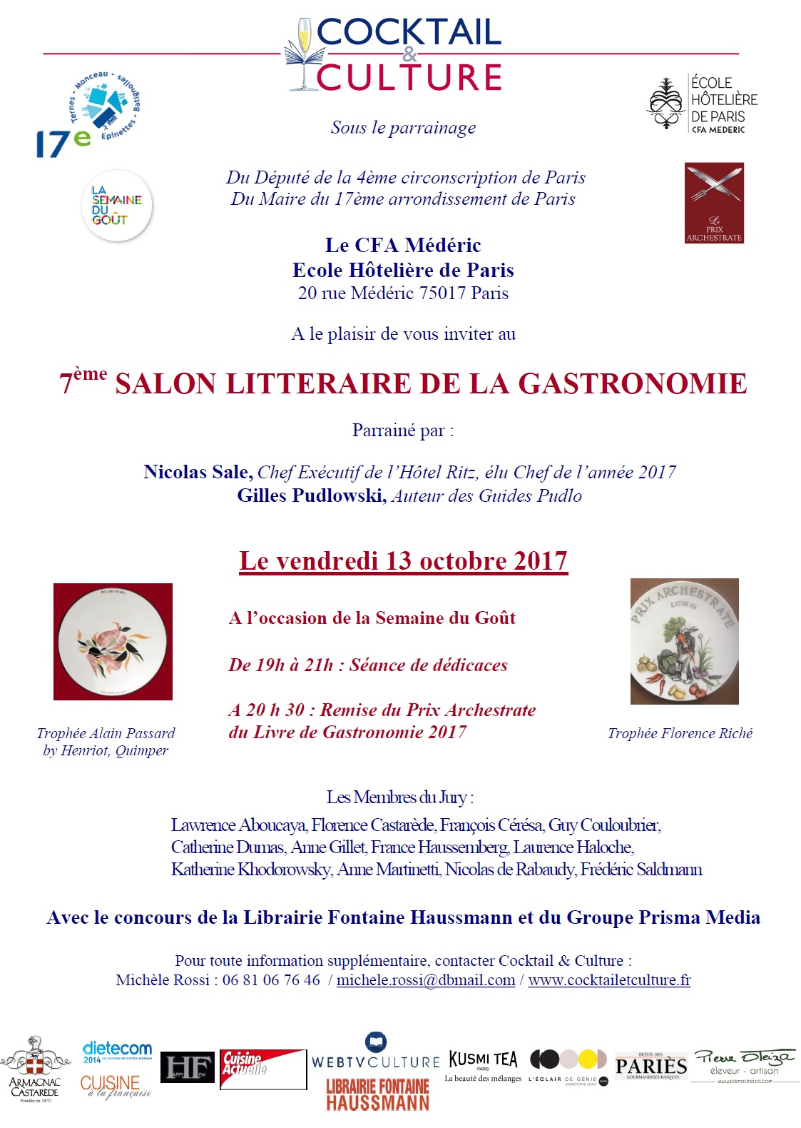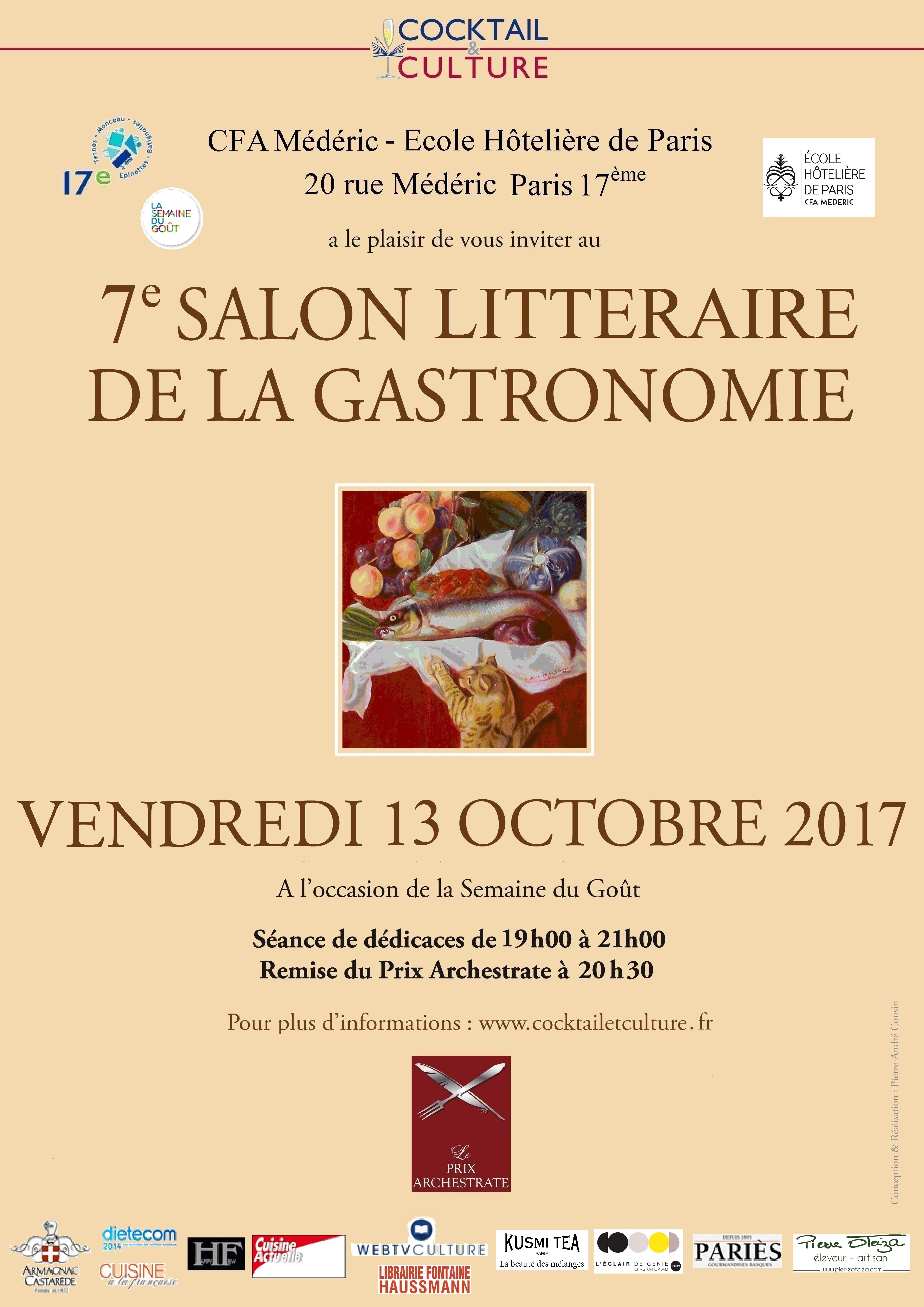 A l’occasion de la Semaine du Goût, le 7ème Salon Littéraire de la Gastronomie, se déroulera le vendredi 13 octobre 2017 de 19h à 21h au CFA Médéric, Ecole Hôtelière de Paris située au 20 rue Médéric 75017 Paris.