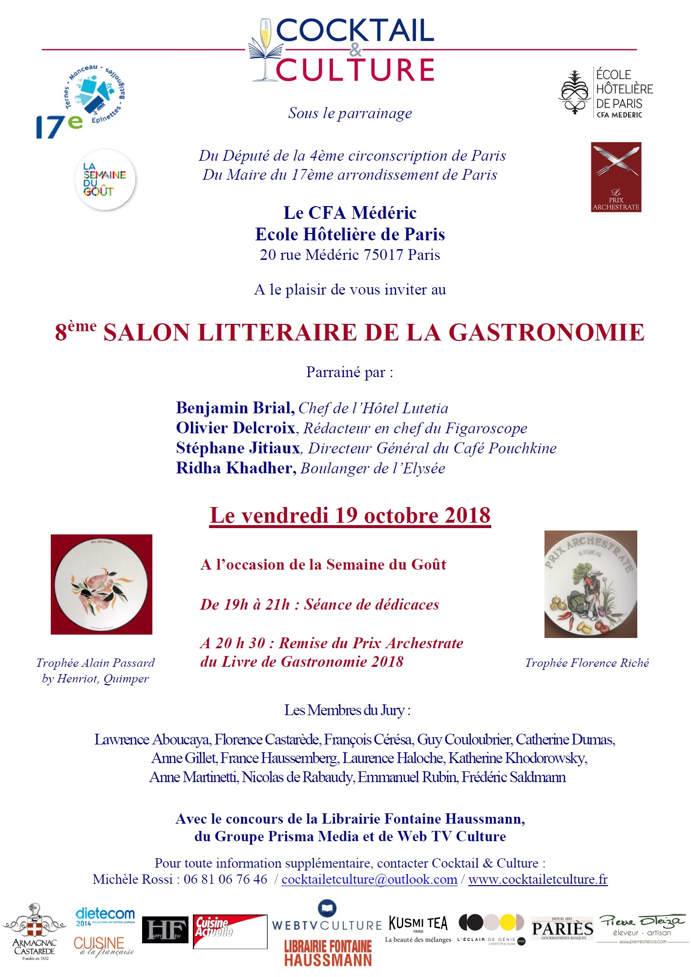 A l’occasion de la Semaine du Goût, le 8ème Salon Littéraire de la Gastronomie, se déroulera le vendredi 19 octobre 2018 de 19h à 21h au CFA Médéric, Ecole Hôtelière de Paris située au 20 rue Médéric 75017 Paris.
