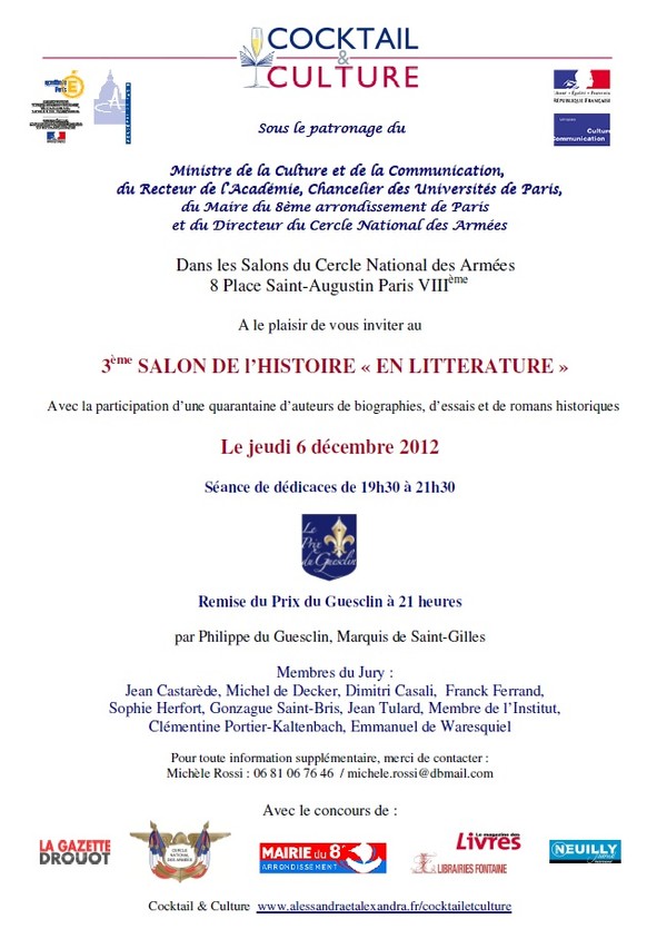 Jeudi 6 décembre 2012, vous avez rendez-vous avec le 3ème Salon de l'histoire "en littérature" au Cercle national des armées avec dès 19h30 une séance de dédicaces en présence d'une soixantaine d'auteurs et dès 21h la remise du Prix du Guesclin. Cliquez ici pour voir les photos.